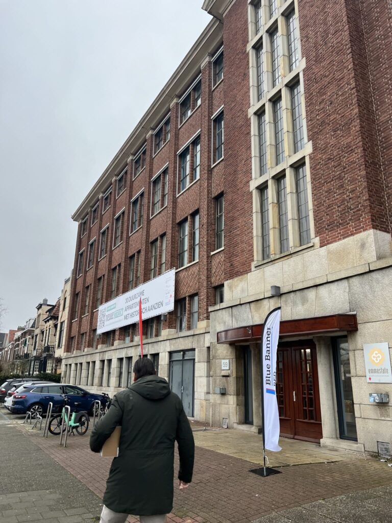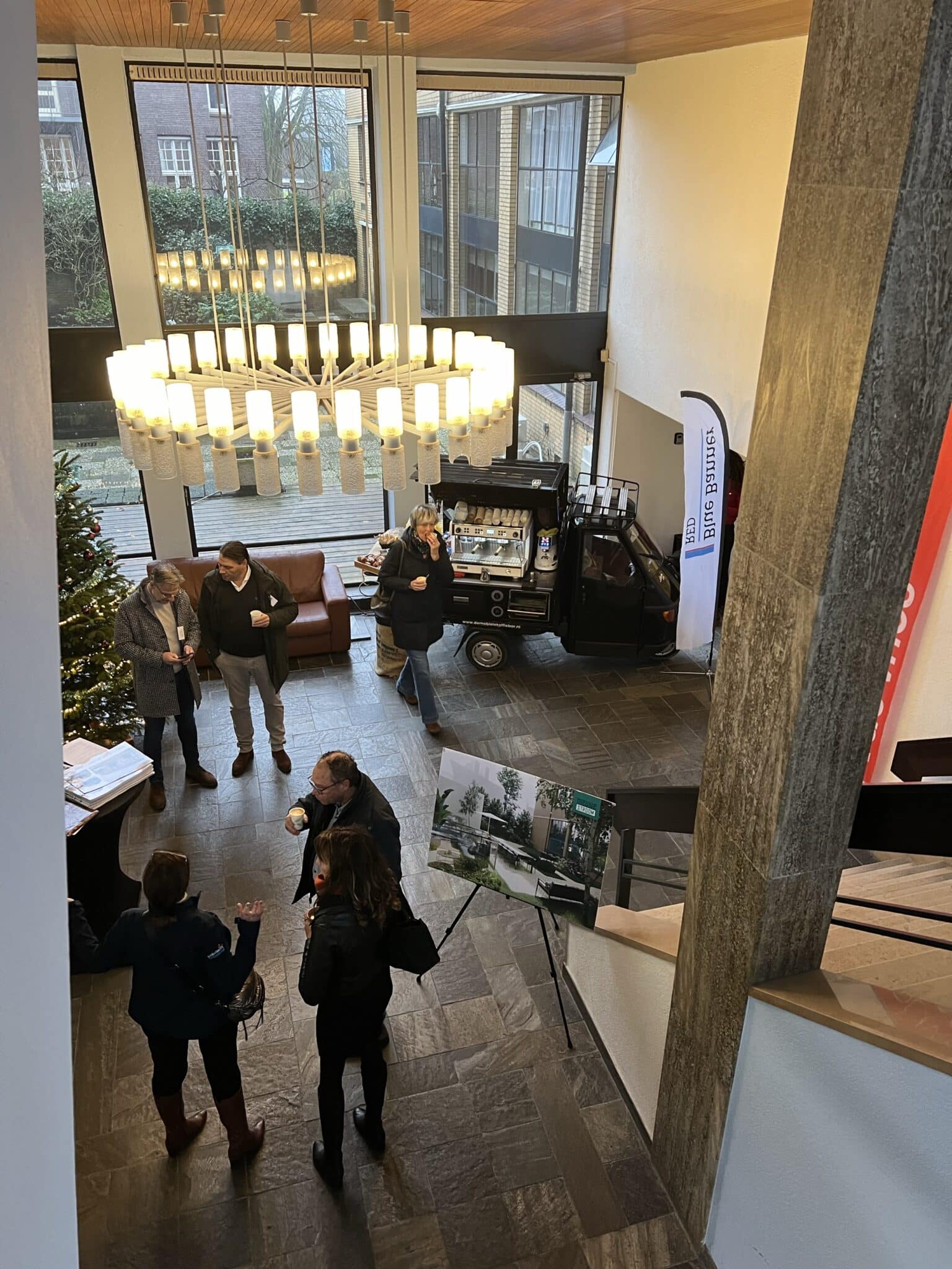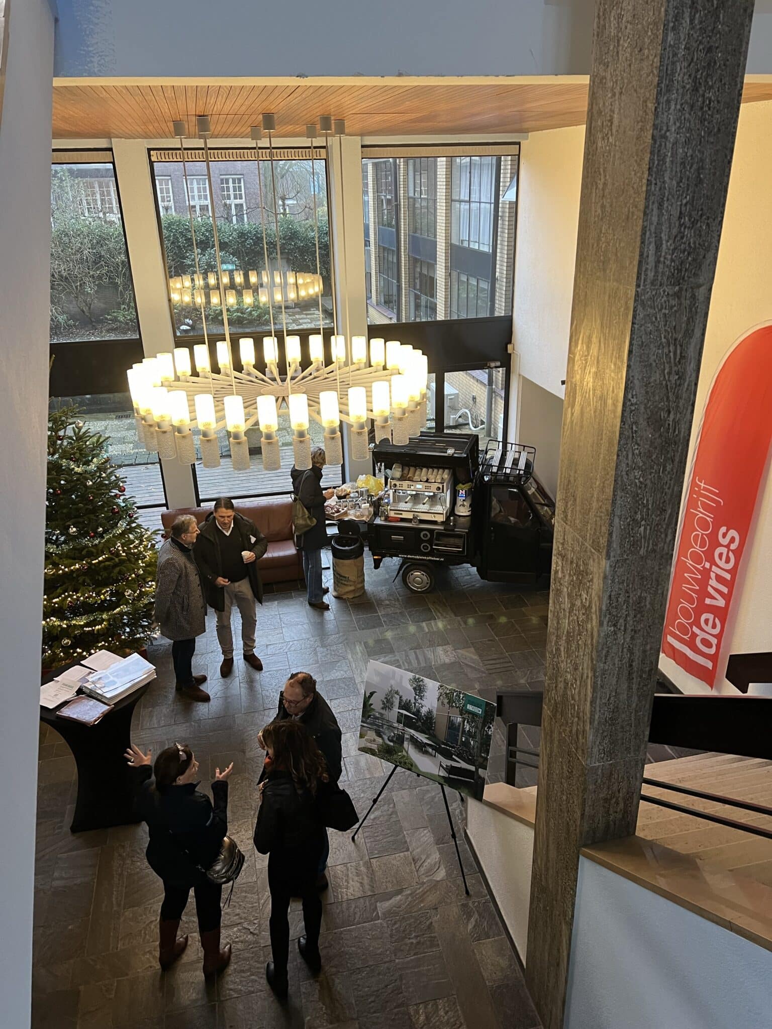 Onder het genot van verse koffie van de barista en verse oliebollen konden geintresseerden door het pand heen lopen waar de appartementen ontwikkeld zullen worden. Door middel van VR brillen konden mensen ook al ervaren hoe het op de plek waar ze op dat moment stonden eruit komt te zien.