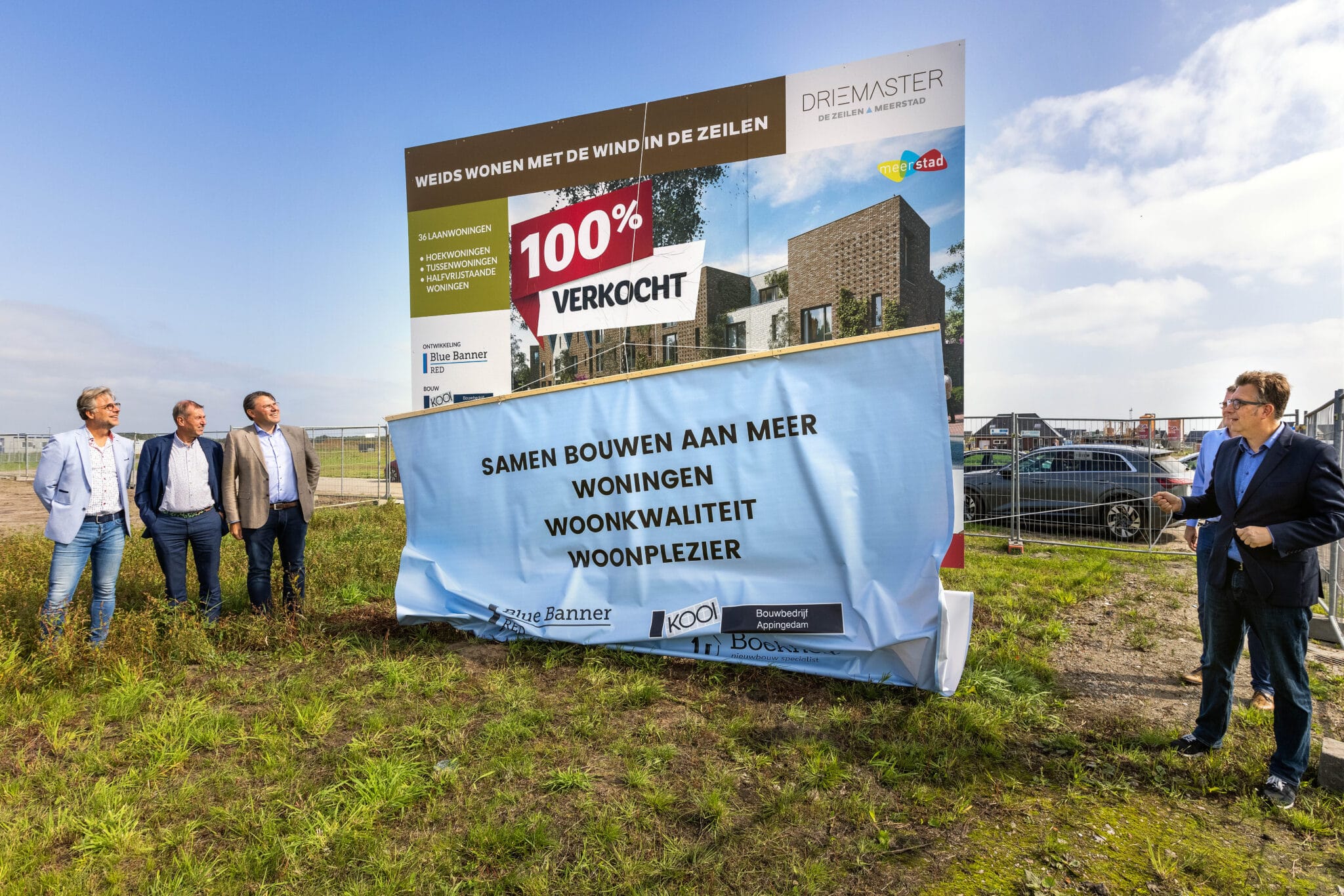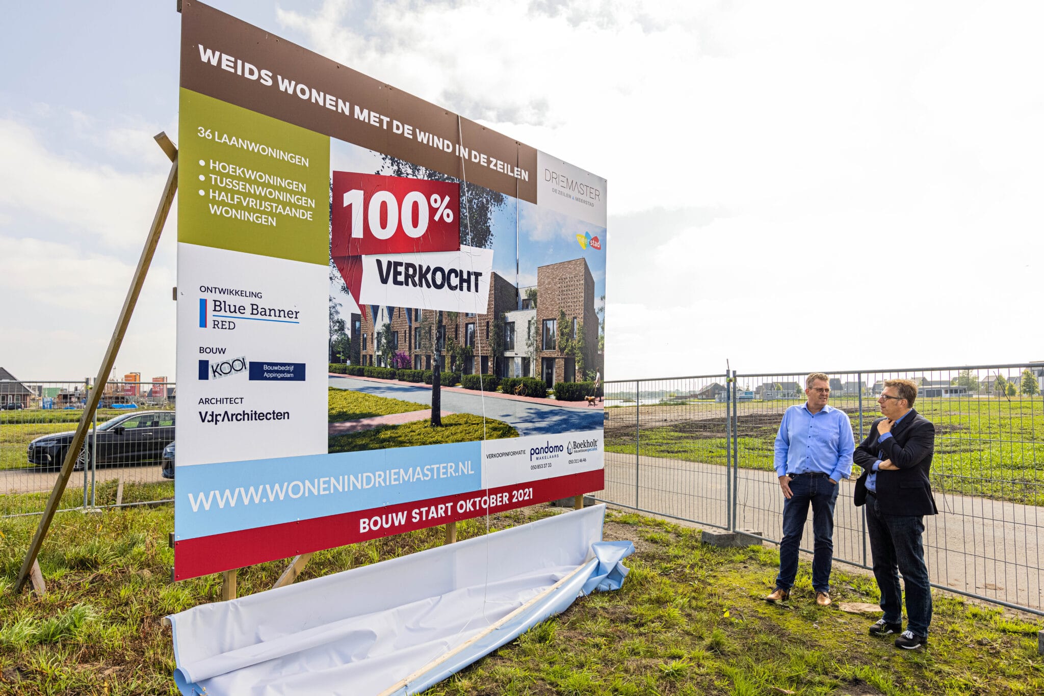Op vrijdag 3 september 2021 is door wethouder Roeland van der Schaaf -met het onthullen van het bouwbord- het startsein gegeven voor het allereerste nieuwbouwproject ‘Driemaster’ in De Zeilen Meerstad Groningen. Het nieuwbouwproject Driemaster van Blue Banner Red in samenwerking met BV Bouwbedrijf Kooi Appingedam bestaat uit 14 hoekwoningen, 20 tussenwoningen en 2 halfvrijstaande woningen. Alle woningen zijn verkocht en er zal snel gestart worden met de realisatie van dit project.